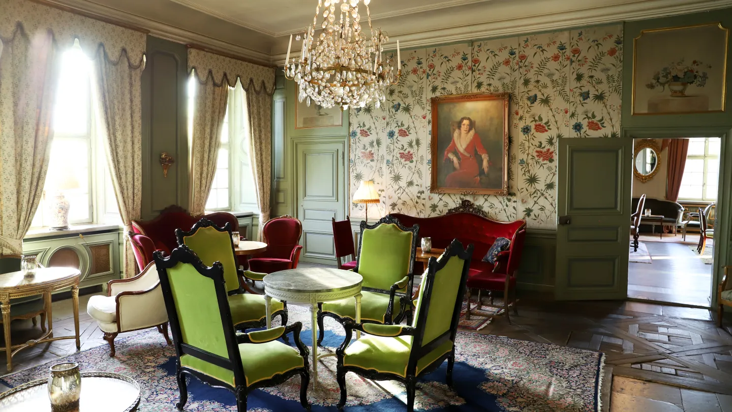 Kinasalongen är fylld med nyckfulla fåtöljer och små bord, för att spela spel, ha eftermiddagste eller att jobba lite. Den handvävda tapeten är särskilt iögonfallande och har använts som bakgrund för många fotograferingar under åren.